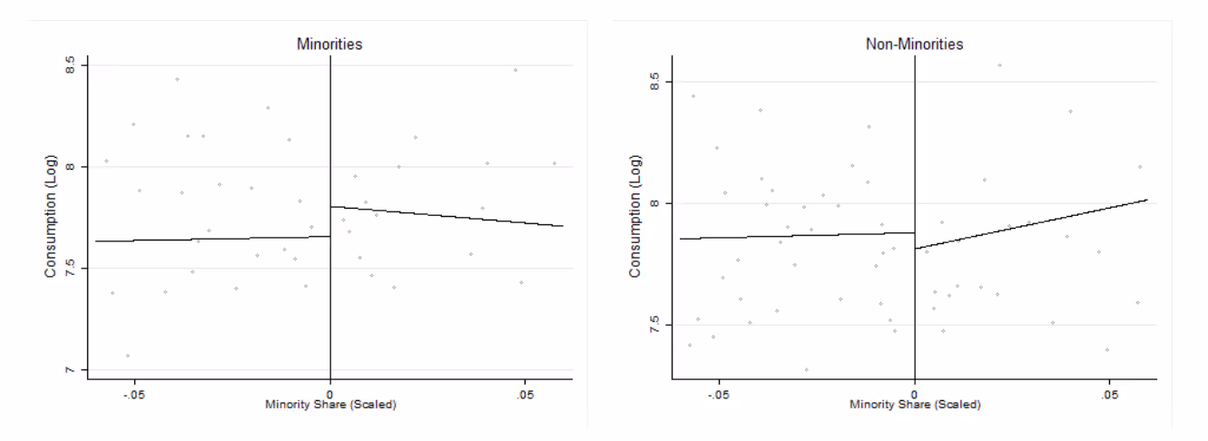 Note: Observations to the right of the vertical line corresponds to districts eligible for the policy (minority population shares of 25-31%); those to the left of vertical line are districts ineligible for the policy (minority population shares of 19-25%).