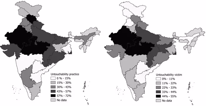 टिप्पणी : यह आँकड़ा गैर-एससी/एसटी परिवारों का प्रतिशत दर्शाता है जिन्होंने अस्पृश्यता को मानने के बारे में सूचित किया और एससी परिवारों का प्रतिशत जिन्होंने अस्पृश्यता के शिकार होने की सूचना दी।