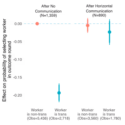 However, horizontal communication between these discriminatory participants substantially reduces discrimination. The effects of the group discussion on discrimination are stark: even when people are making private, individual choices after the discussion has ended, they are 17 percentage points (42%) more likely to select a transgender worker than the control group (who were not involved in a discussion) (Figure 1, right panel). The level implies that there is no significant anti-transgender discrimination, on average, in the discussion arm.