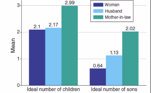 महिलाओं और उनकी सास के बीच बच्चों और बेटों की आदर्श संख्या के मामले में काफी अंतर है। हमारे नमूने में शामिल अधिकांश महिलाएं (78%) अपनी सास के साथ रहती हैं, लेकिन उनमें से आधी ने बताया कि उन्होंने कभी भी उनके साथ परिवार नियोजन के बारे में चर्चा नहीं की। इसके अलावा, 42% महिलाओं का मानना है कि उनकी सास परिवार नियोजन को मंज़ूरी नहीं देती हैं और 72% का मानना है कि उनकी सास चाहती हैं कि वे जितने बच्चे चाहती हैं, उससे ज़्यादा बच्चे पैदा करें। एक औसत सास चाहती है कि उसकी बहू को एक और बच्चा हो और बहू की इच्छा से 1.4 ज़्यादा बेटे हों (आकृति-1)।
