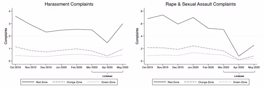 भारत में सरकार द्वारा लागू किए गए अनिवार्य लॉकडाउनों की तीव्रता में भिन्नता का उपयोग करते हुए हम दिखाते हैं कि सख्त लॉकडाउन नियमों वाले जिलों में मई 2020 में घरेलू हिंसा की शिकायतों में 0.47 मानक विचलन 2 (131%) की वृद्धि हुई है। हम सख्त लॉकडाउन नियमों वाले जिलों में साइबर क्राइम की शिकायतों में भी इसी प्रकार की बड़ी वृद्धि पाते हैं। दिलचस्प बात यह है कि इन जिलों में इसी अवधि के दौरान बलात्कार और यौन उत्पीड़न की शिकायतों में 0.39 मानक विचलन (119%) की कमी आई है जो सार्वजनिक स्थानों, सार्वजनिक परिवहन और कार्यस्थलों में महिलाओं की आवाजाही में आई कमी (उदाहरण के लिए, बोर्कर 2018 देखें) के अनुरूप है। महत्वपूर्ण रूप से इन परिणामों से यह पता चलता है कि महिलाएं विशेष प्रकार के खतरों का सामना करती हैं और इस प्रकार की नीति विशिष्ट प्रकार की हिंसा के परिणामों में सुधार कर सकती है जबकि अन्य प्रकार के खतरों को बढ़ा सकती है।