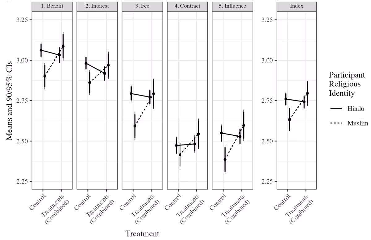 The findings on ethnic diversity were also unexpected. We used data from GPS coordinates of respondents to produce a fine-grained and highly accurate measure of diversity, estimating the proportion of Hindus and Muslims within a 100-metre radius (equivalent of a few streets) for each respondent. Using this measure, neighbourhood diversity had no effect on the results. Further, the treatment effects for Muslims in majority-Hindu and majority-Muslim neighbourhoods were stronger, providing further evidence that there is no clear relationship between neighbourhood diversity and the effect of our interventions. Our results hold after accounting for a host of relevant factors, including the strength of social ties, gender, and socioeconomic status, and we do not find any evidence that religiosity or cultural distinctiveness of Muslims shaped the outcomes.