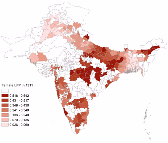 The rate of FLFP in 1901, averaged across districts, was 31%, higher than the 21% reported by the World Development Indicators for 2019. This is not surprising: women’s participation in economic activity is higher in agricultural societies at low levels of income. In 1911, 73% of women workers were in agriculture and related activities; 11% in industry, mining, and construction; 12% in trade, transport, and other services; and 4% in what the census called “insufficiently described occupations.” The latter, which included small jobs in agriculture, construction, and services, the share of women workers could be as high as 40%. Roy (2005) identifies gender segmentation in the colonial labour market. The work done by women was concentrated in specific industries and services, including bidi rolling, hand spinning, basket weaving, grain processing by hand, and stone cutting. Some industries rarely hired women. These included metal working, chemicals, and printing. Some industries employed both men and women, though specific tasks were largely segregated by gender, as in mining, cotton textiles, and quarries.