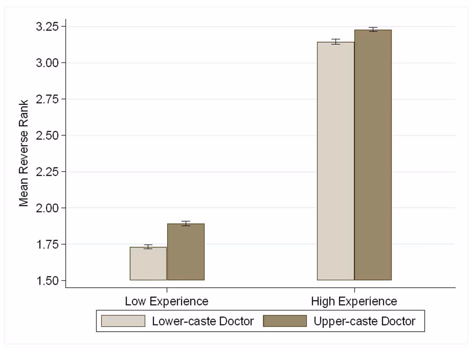 दूसरी ओर, जाति-आधारित भेदभाव के प्रमाण भी मिलते हैं। चित्र 3 से पता चलता है कि उच्च स्तर के अनुभव और साथ ही निम्न स्तर के अनुभव- दोनों सन्दर्भों में, निचली जाति के डॉक्टरों की तुलना में उच्च जाति के डॉक्टरों का औसत रिवर्स रैंक अधिक है। इस प्रकार, यह दर्शाता है कि अनुभव के बावजूद निचली जाति के डॉक्टरों के साथ हमेशा भेदभाव किया जाता है।