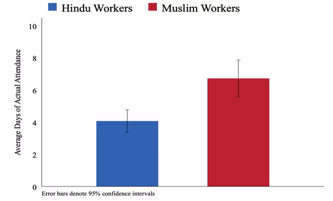 आकृति 3 में हिंदू और मुस्लिम श्रमिकों की औसत उपस्थिति (अप्रैल के अंत तक, अधिकतम 12 दिनों में से) को अलग-अलग दिखाया गया है। जिन हिंदू श्रमिकों से संपर्क किया गया, उनमें से औसतन आधे से ज्यादा अपने मुस्लिम समकक्षों के बराबर दिन काम करते हैं। यह व्यवहार आकृति 1 में सारांशित सर्वेक्षण प्रतिक्रिया के अनुरूप है।