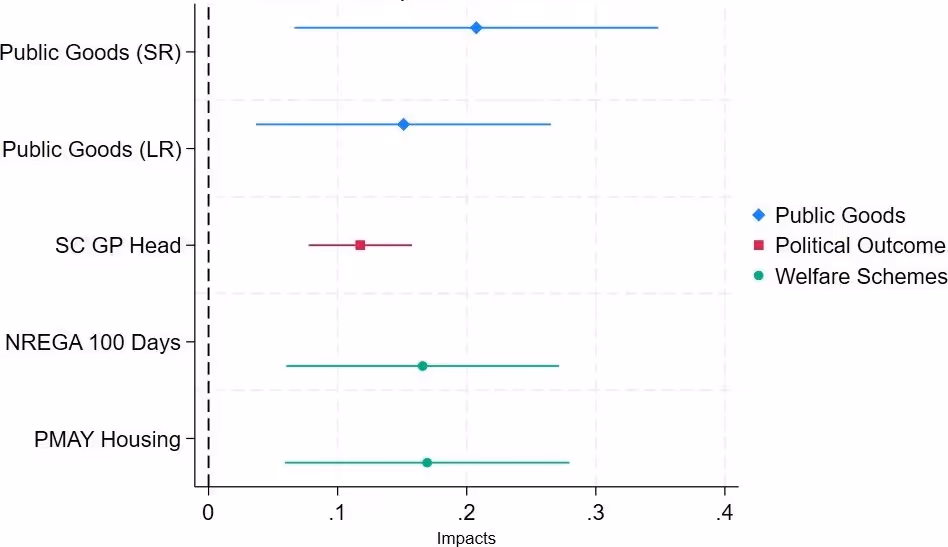 टिपण्णी: मापे गए पाँच परिणाम हैं : (i) अल्पावधि में सार्वजनिक सुविधाओं पर मानकीकृत प्रभाव (जनगणना, 2011), (ii) वर्ष 2016-2018 से गाँव की गलियों और नालियों की परियोजनाओं पर प्रशासनिक डेटा में मानकीकृत दीर्घकालिक प्रभाव (पंचायती राज विभाग के स्रोत से)), (iii) एससी के ग्राम पंचायत प्रमुख बनने की सम्भावना पर प्रभाव (वर्ष 2016 के जीपी चुनावों में), (iv) वर्ष 2016-2019 तक प्रति एससी व्यक्ति के लिए बनाए गए पीएमएवाई घर) और (v) नरेगा योजना के तहत 100 दिन का काम मिलने वाले एससी परिवारों का सामान्यीकृत हिस्सा (2014-2015)