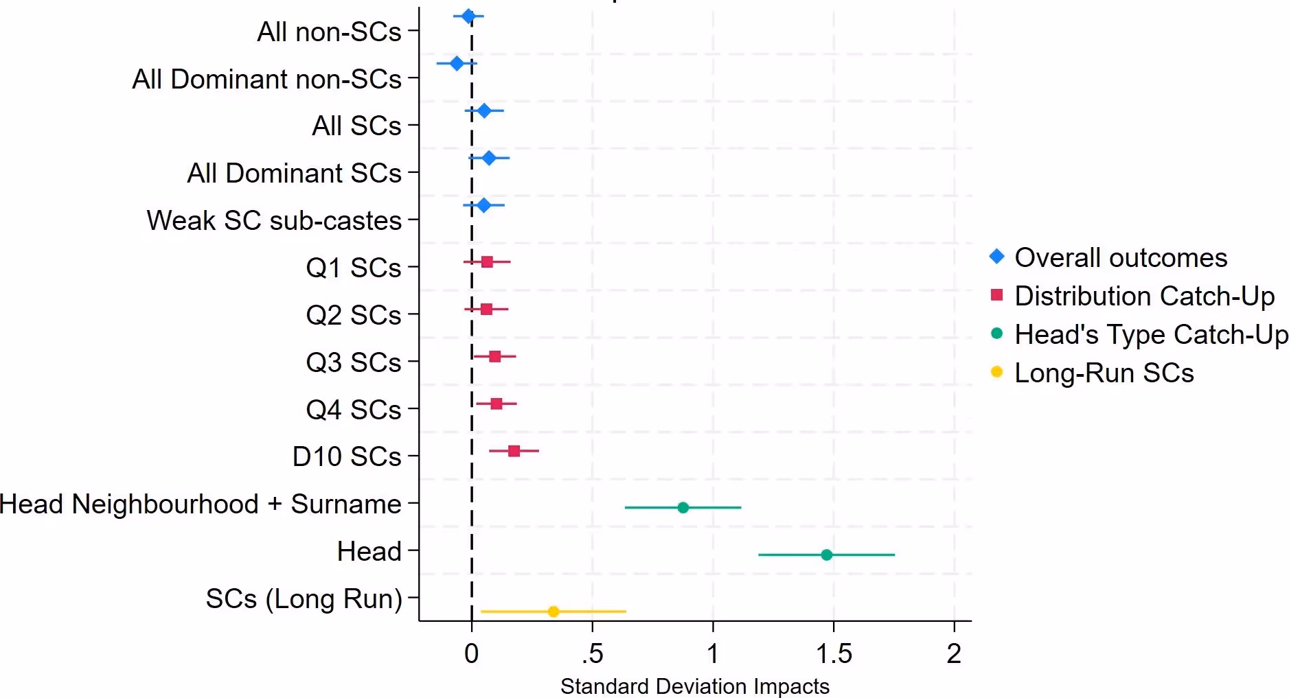 टिप्पणियाँ: i) यह आँकड़ा मानक विचलन के सन्दर्भ में विभिन्न उप-आबादी में परिसंपत्ति स्कोर पर प्रभाव दर्शाता है। ii) नीले डायमंड मार्कर पूर्ण स्कोर से संबंधित हैं। iii) लाल वर्ग के मार्कर माध्य गैर-एससी क्विंटाईल के साथ मेल को दर्शाते हैं। प्रत्येक मार्कर एक अलग एससी चतुर्थक को दर्शाता है- उदाहरण के लिए, "क्यू1 एससी" निचले चतुर्थक में औसत एससी और मध्य चतुर्थक में औसत गैर-एससी के बीच के अन्तर को इंगित करता है। iv) हरे गोलाकार मार्कर माध्य गैर-एससी क्विंटाईल के साथ मेल को दर्शाते हैं। हालाँकि, आरक्षित समूह में, हम केवल ग्राम प्रधान से जुड़े व्यक्तियों पर ध्यान केन्द्रित करते हैं- "प्रधान पड़ोस + उपनाम" में प्रधान से 20-परिवार की दूरी के भीतर के सभी लोग शामिल होते हैं जो प्रधान का उपनाम भी साझा करते हैं, जबकि "प्रधान" में केवल प्रधान का परिवार शामिल होता है। v) पीले मार्कर हमारे प्राथमिक सर्वेक्षण से एससी पर दीर्घकालिक प्रभावों का संकेत देते हैं। vi) 90% कॉन्फिडेंस इंटरवल शामिल हैं।