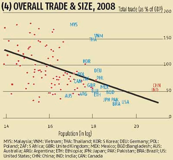 Figure 4 plots, for a number of countries, their overall trade-to-GDP ratio (on the vertical axis) against their size (measured in terms of land or area on the horizontal axis). The line shows the average relationship between trade outcomes and country size. That line is downward-sloping, confirming the geography-based intuition that large countries trade less. For example, the large countries such as China, India, Brazil, the United States and Japan are all in the lower right-hand corner with low trade (below 50-55%) ratios.