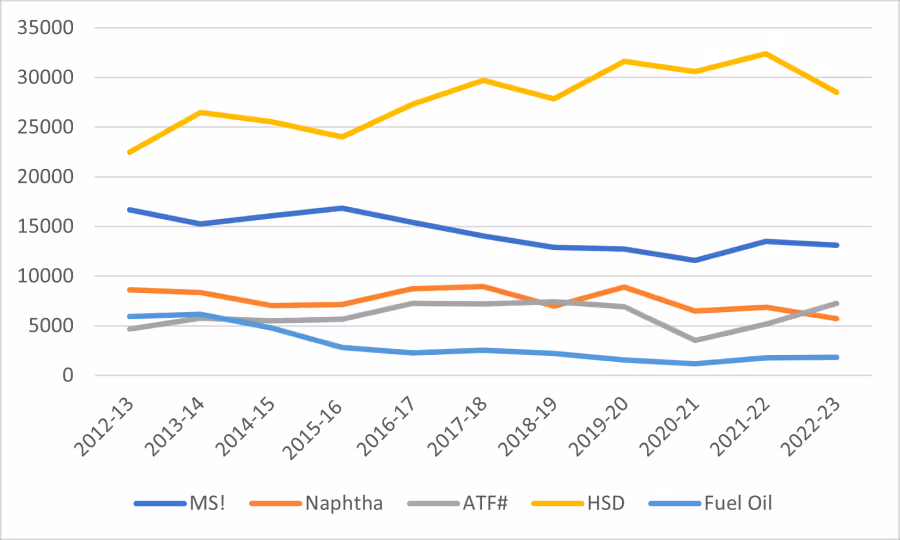 Figure 3. India’s key petroleum exports by volume, from 2012-13 to 2022-23 (in 1000 metric tonnes)
