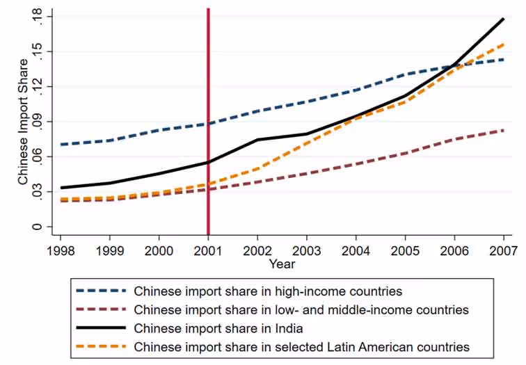 To address remaining endogeneity concerns, we ‘instrument’3 for Chinese imports to India with Chinese imports to a set of Latin American countries, to isolate the variation in Chinese imports to India that are only driven by supply-side factors in China. The choice of Latin American countries was motivated by the fact that they are not major trade partners with India and hence, are unlikely to have a direct influence on informality in India.