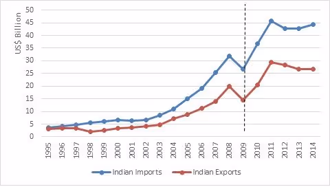 Note: The dotted line for year 2009 implies the signing of India-ASEAN FTA
