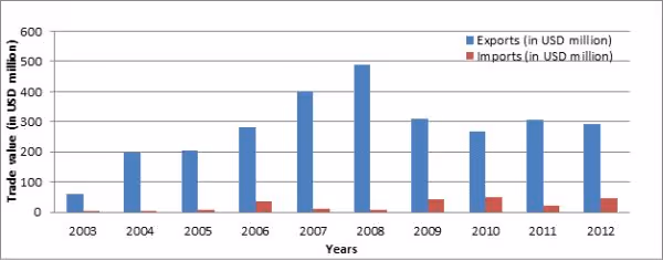Figure 1. Indian pharmaceutical exports to and imports from Pakistan (2003-2012)
