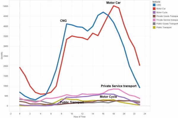 The traffic flow data can also be decomposed by vehicle type, as in Figure 4, to better define preferred modes of travel of Dhaka commuters. Looking at CNG (Compressed Natural Gas) vehicles (three-wheeler commonly used as taxis), their traffic volume is at its minimum around 2 am; increases steeply around 5 am and 6 am reaching the morning peak by 9 am; decreases at 1 – 2 pm during lunch time; and increases again to reach its daily peak at 6 pm.