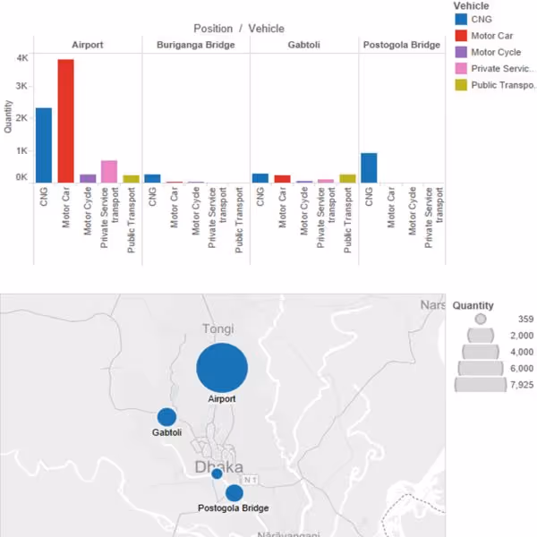 As illustrated by the map, Airport Road is the most heavily trafficked road during peak commuting hours, followed by Gabtoli Bridge, Postogola, and Buriganga Bridge. Vehicle data from Figure 5 can be used to infer differences in socioeconomic characteristics of commuters. Airport road commuters are, on average, wealthier; the average commuter uses cars and private transport services. The preferences in modes of transport of Gabtoli commuters appear to be more disparate relative to Postogola and Buriganga Bridge commuters. Airport Road and Gabtoli commuters also have a greater supply of public transport services than Buriganga and Postogola Bridge, where supply is minimal. Gabtoli commuters are wealthier than Postogola and Buriganga Bridge commuters, as highlighted by the relatively higher proportion of private transport vehicles, including motorcycles and cars.