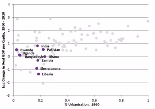 Developing countries are urbanising at impressive rates with trends set to continue. Urbanisation is an instrumental stepping stone for countries moving from poverty to prosperity. In fact, the relationship between urbanisation and income is stronger today than it was in 1960. Figure 1 illustrates that, on average, higher levels of urbanisation in 1960 are associated with faster growth rates. This might reflect the positive impact that higher density has on productivity and employment (Dempster and Glaeser 2015).