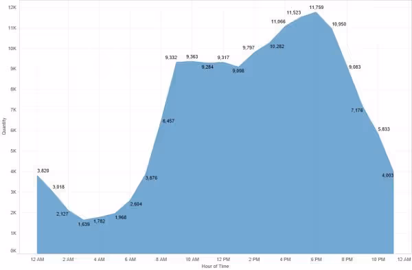 Hourly traffic volume data in Figure 3 below provides a more granular analysis of traffic flows on the same day. The volume peaks at the two main commuting times, 9 am and 6 pm.
