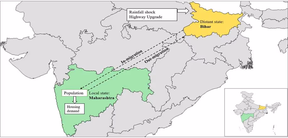 टिप्पणियाँ: (i) नक्शा भारत के मध्य भाग का एक स्नैपशॉट प्रस्तुत करता है जिसमें के 'स्थानीय राज्य' महाराष्ट्र और 'दूरस्थ राज्य' बिहार पर प्रकाश डाला गया है। (ii) बिहार में नकारात्मक वर्षा के झटके और राजमार्ग उन्नयन होता है। इससे होने वाला अंतर-राज्य प्रवासन महाराष्ट्र की शहरी जनसंख्या वृद्धि में परिवर्तन के माध्यम से महाराष्ट्र में आवास की मांग को प्रभावित करता है।